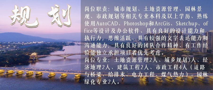 崗位專業:土地資源管理2人、城鄉規劃3人、經濟地理2人、建筑工程2人、市政工程4人、園林綠化專業2人。