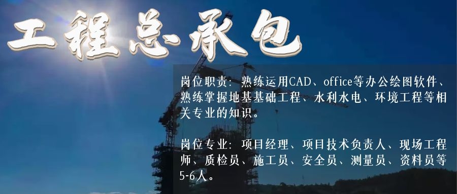 崗位專業:項目經理、項目技術負責人、現場工程師、質檢員、施工員、安全員、測量員、資料員等5-6人。